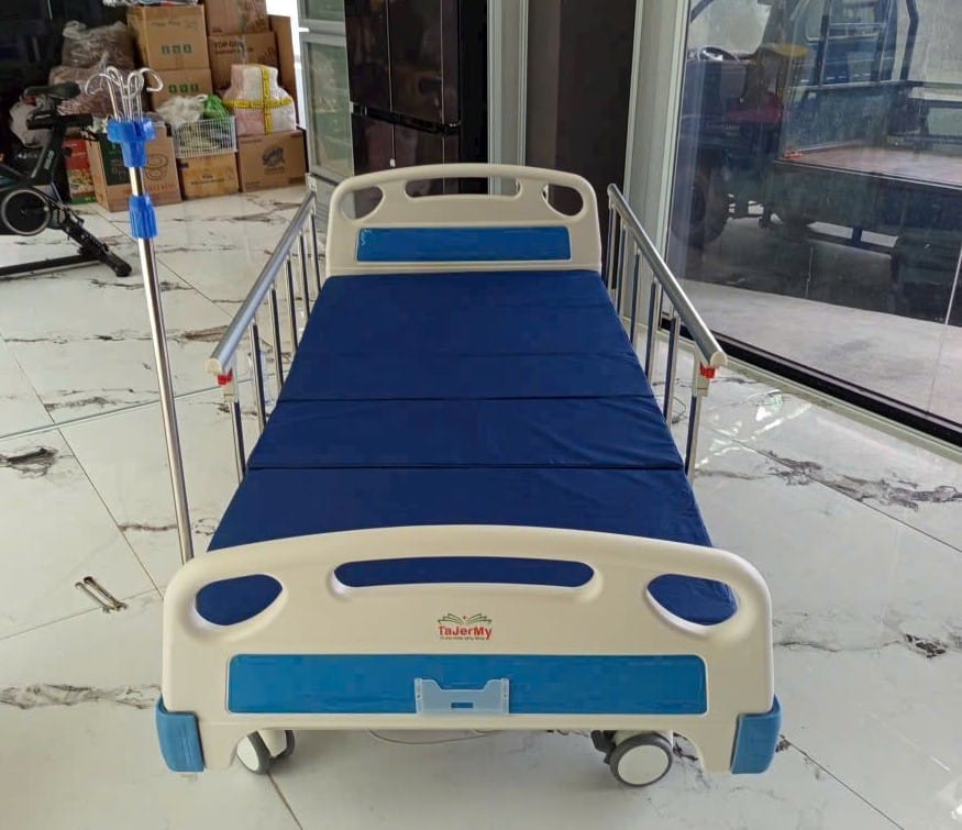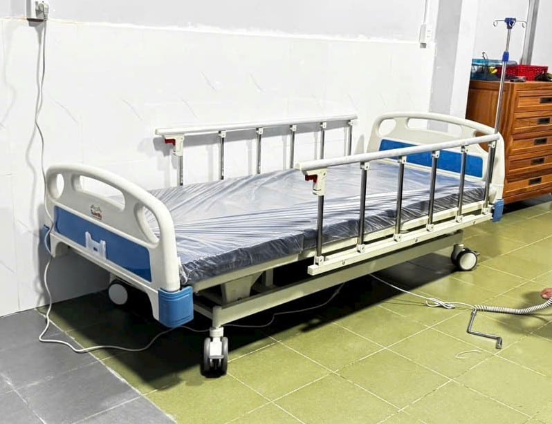 Giường được trang bị thanh chắn bảo vệ, giúp bệnh nhân không bị té ngã. Bánh xe có khóa cố định giữ giường vững chắc khi sử dụng, đảm bảo an toàn trong quá trình điều trị.